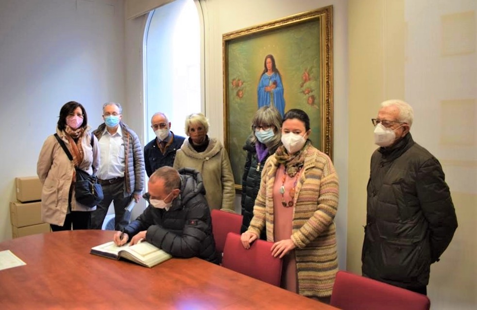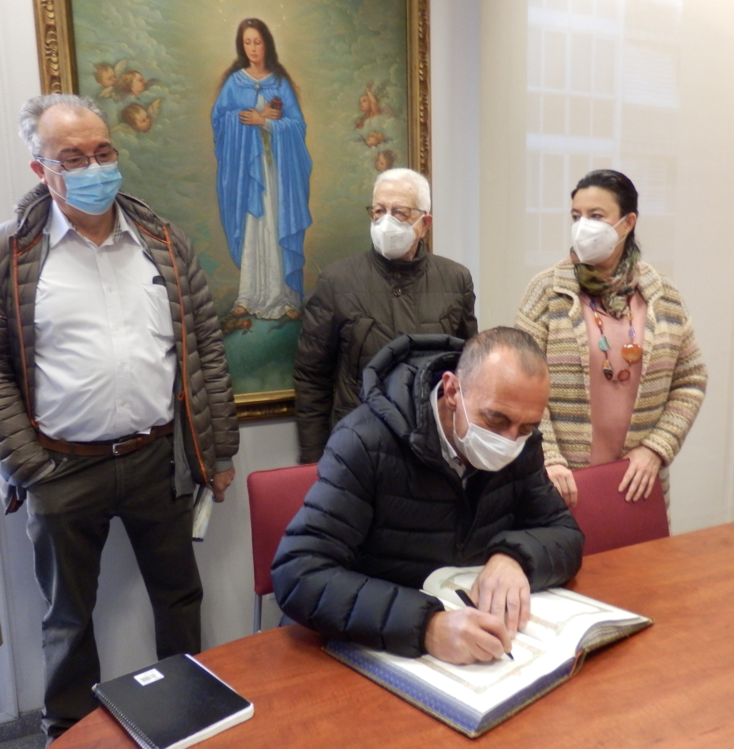 Després l’alcalde ha conegut la resta de les instal·lacions de l’Acadèmia Mariana com el Teatre i el Paranimf modernista. També ha visitat la Biblioteca-Arxiu de l’Acadèmia Mariana on es guarden els llibres on es publiquen les obres premiades del Certamen Marià, així com diverses col·leccions de llibres marians i que constitueixen un valuós patrimoni. A continuació, l’alcalde Pueyo ha signat al Llibre d’Or de l’Acadèmia Mariana amb una bona i sentida dedicatòria. El paer en cap s’ha interessat, entre d’altres, per la signatura de Mossèn Cinto Verdaguer el 13 de maig de 1901: "Maria / al cel guia / per camí de flors: / anem-hi / volem-hi / cantant sos amors."
